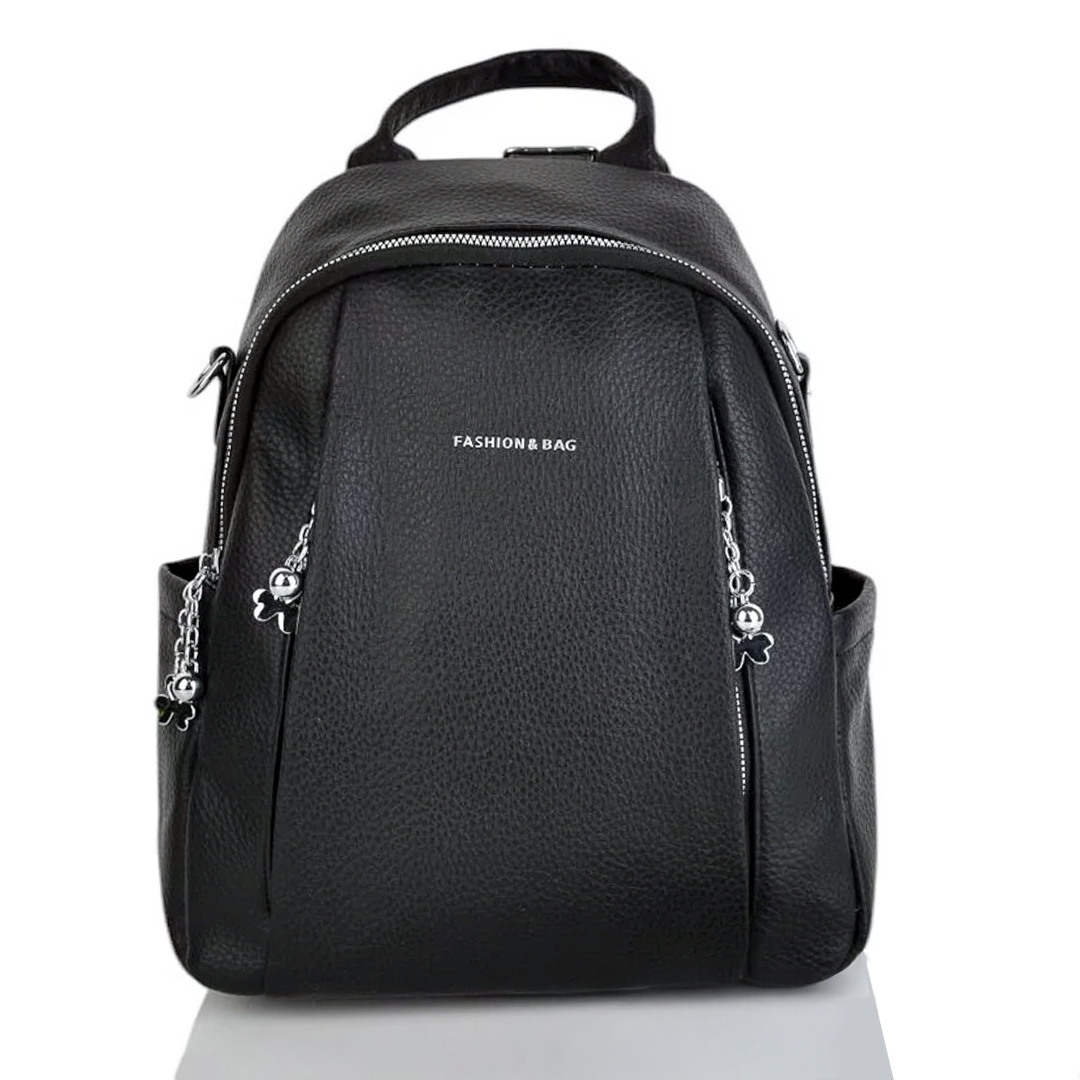 Практичний чорний рюкзак з екошкіри з одним великим відділенням та кількома меншими кишенями всередині. На передній частині сумки є два менших відділення, які також застібаються на блискавку. На задній частині знаходиться звичайна кишеня на блискавці та регульовані плечові ремені! Ви також можете носити її на плечі за допомогою прикріплюваного широкого плечового ременя.