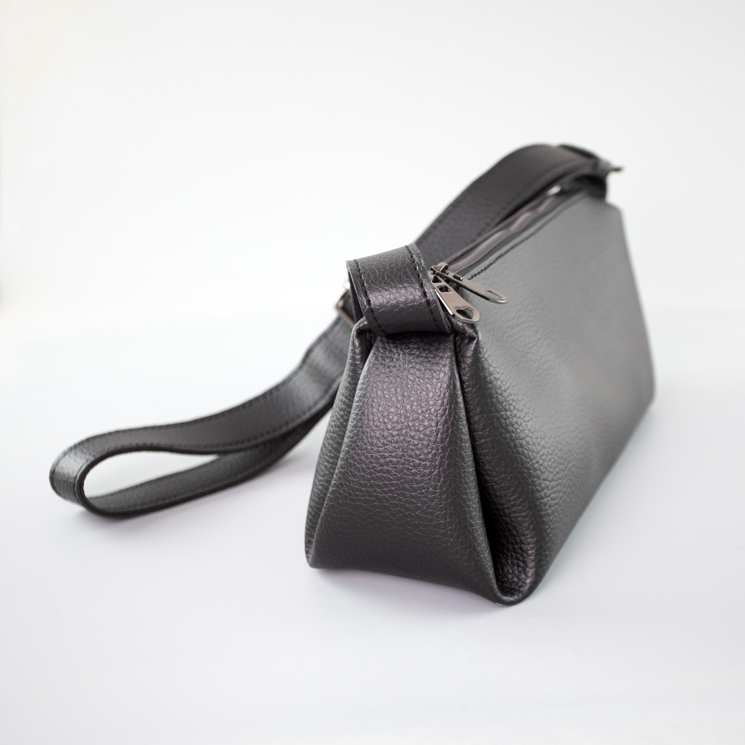 Жіноча сумка в класичному чорному кольорі. Сумка легко відкривається. Виконана на щільній якісній підкладці. У комплекті довгий ремінець.