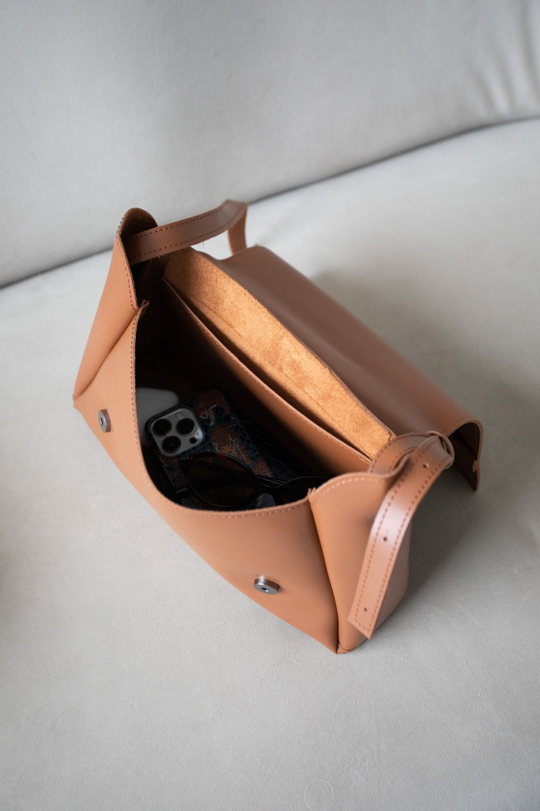 Жіноча сумка в ніжному карамельно-рудому кольорі. Сумка легко відкривається. Виконана на щільній якісній підкладці. У комплекті довгий ремінець.