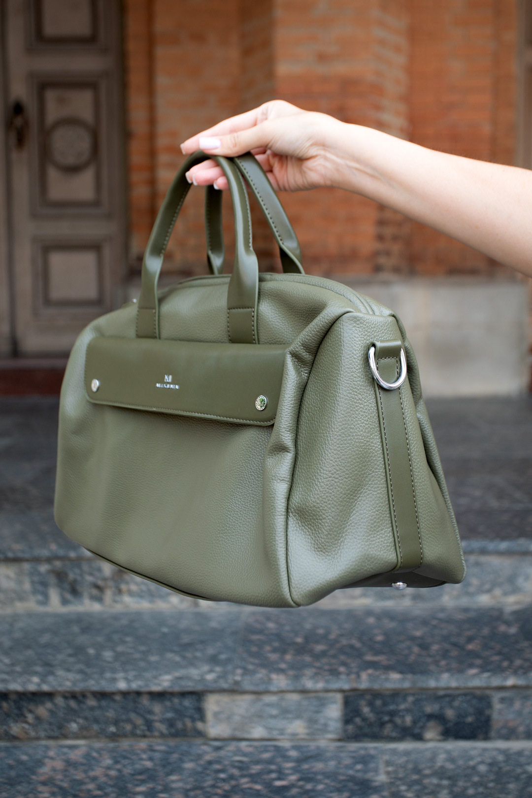 Жіноча дорожня сумка в стильному хакі кольорі. Сумка відкривається за допомогою блискавки. Виконана на щільній якісній підкладці. Ремінець є у комплекті і він регулюється.