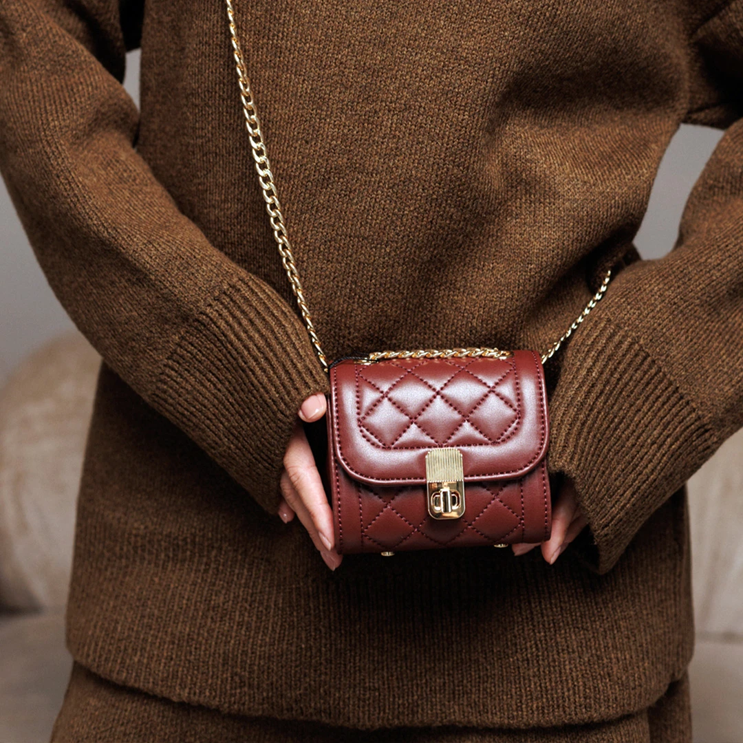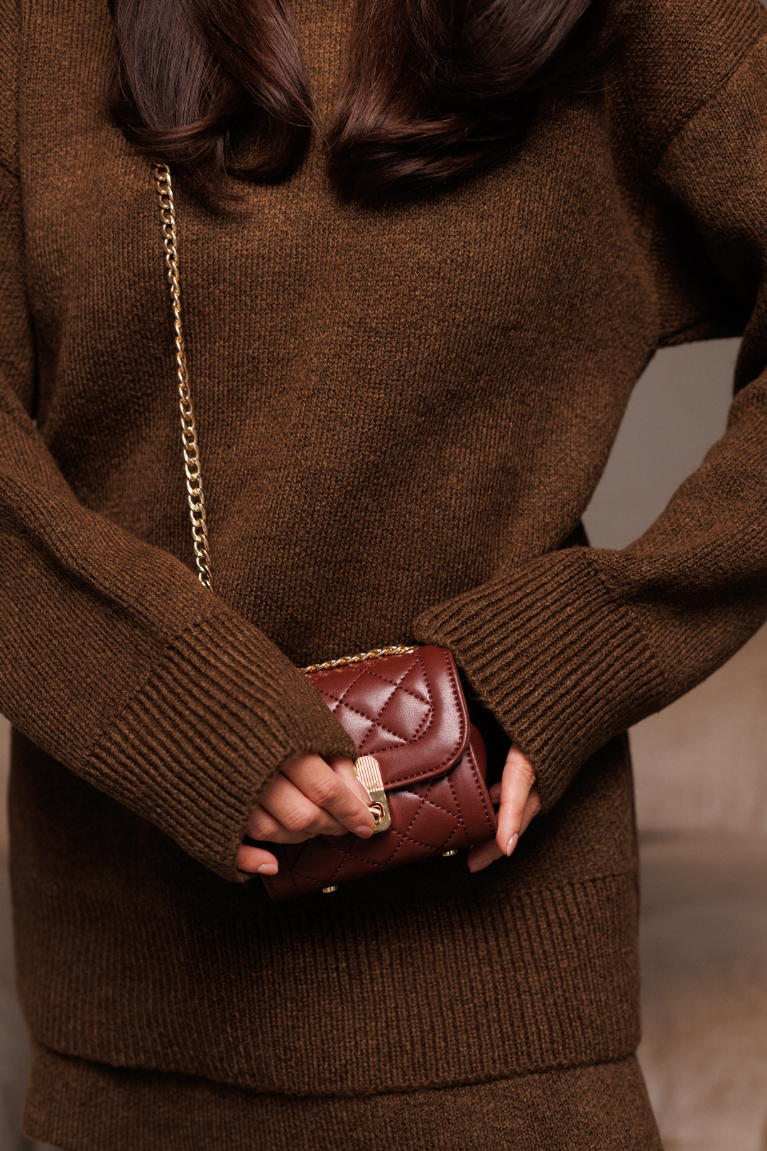 Жіноча сумка в стильному бордовому кольорі на золотистій фурнітурі. Сумка відкривається за допомогою защіпки. Виконана на щільній якісній підкладці та з довгим ланцюжком.