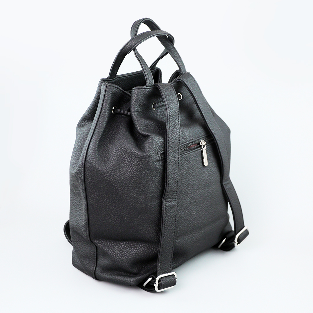 Цей елегантний чорний рюкзак виготовлений із м’якої фактурної екошкіри, що поєднує сучасний дизайн і високу функціональність. Модель закривається за допомогою зручної затяжки та верхнього металевого елемента, який додає виробу вишуканості.