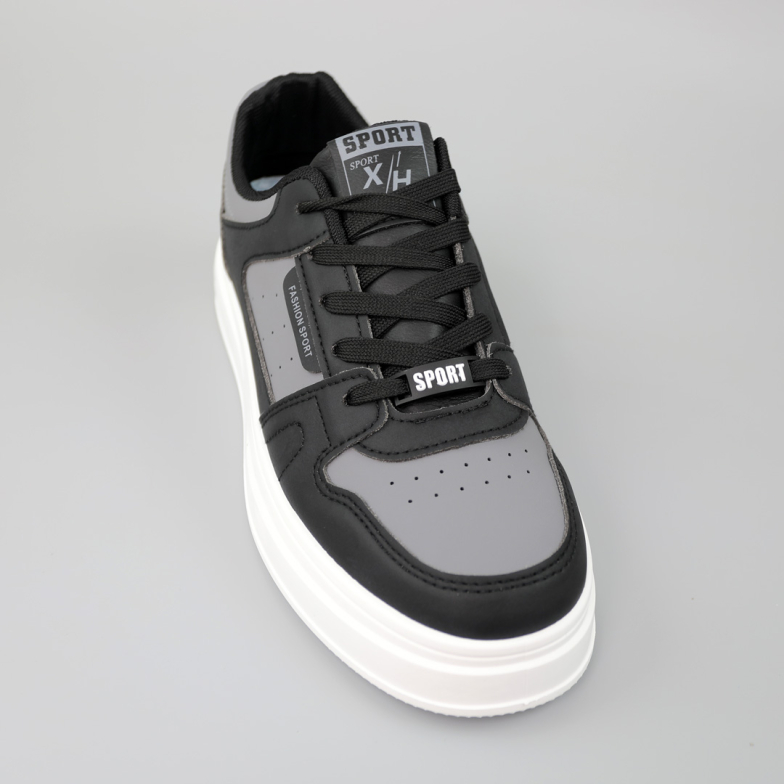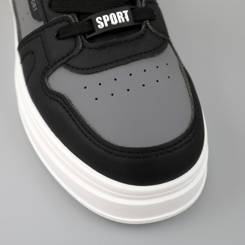 Стильні кеди в універсальному чорно-сірому кольорі, виконані з екошкіри. Внутрішня підкладка з текстилю, устілка - просиліконена, додає комфорту під час ходіння. Підошва - EVA, забезпечує зручність в експлуатації, чудову амортизацію та надійне зчеплення. Завершує унікальний класичний дизайн для такої моделі круглий мис. Такі кеди будуть доречні для побудови модних образів для міжсезоння у молодіжному та повсякденному напрямках.