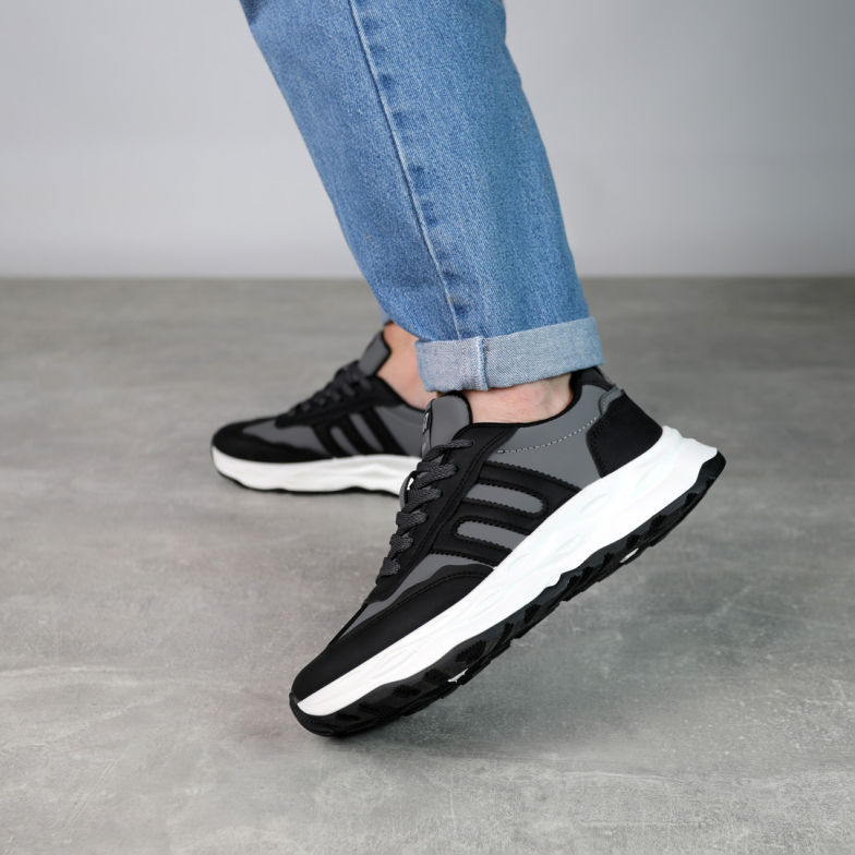 Стильні кросівки в універсальному сіро-чорному кольорі, виконані з високоякісної екошкіри. Внутрішня підкладка з текстилю, устілка - меморі, додає комфорту під час ходіння. Підошва - EVA, забезпечує зручність в експлуатації, чудову амортизацію та надійне зчеплення. Завершує унікальний класичний дизайн для такої моделі круглий мис. Такі кросівки будуть доречні для побудови модних образів для міжсезоння у молодіжному та повсякденному напрямках.