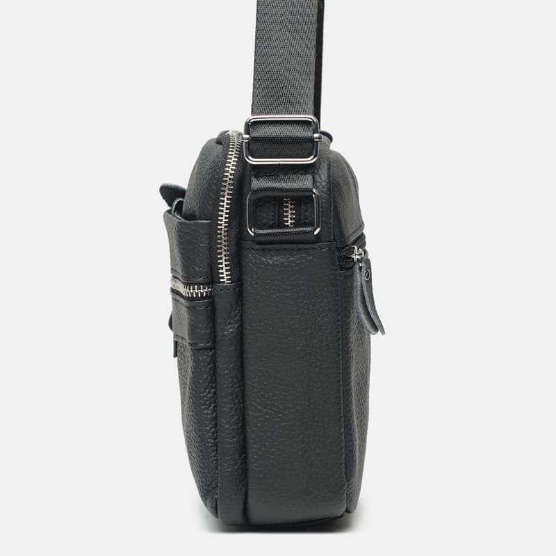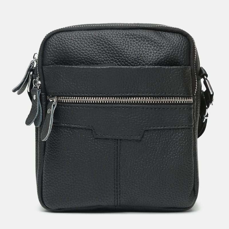 Мужская кожаная сумка выполнена из натуральной кожи. Имеет 2 отделения на молниях. Внутри 1 карман на молнии. Снаружи - 3 горизонтальных кармана на молнии. Подкладка-текстиль. Цвет фурнитуры-серебро. Несъемный плечевой ремень регулируется по длине.
