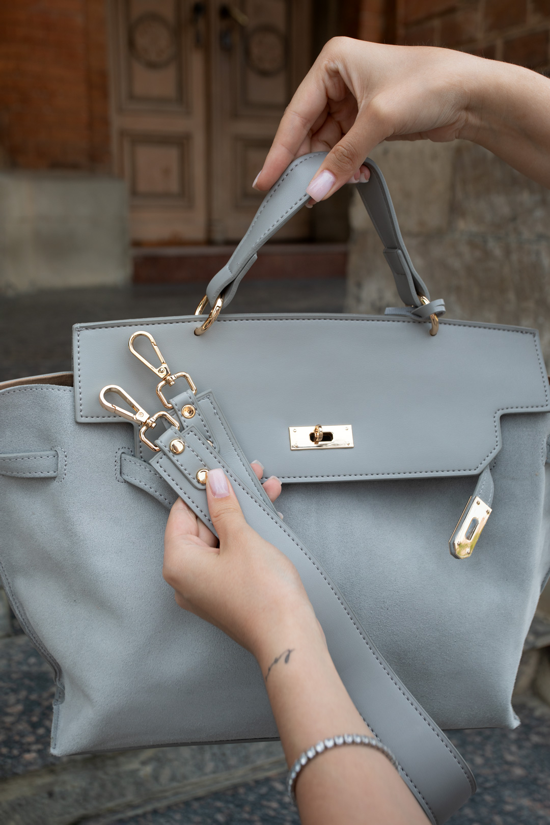 Женская сумка в классическом сером цвете. Сумка открывается молнией. Выполнено на плотной качественной подложке. Ремешок в комплекте и он регулируется.