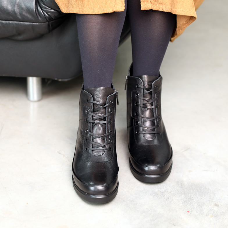 Универсальная модель ботинок в черном цвете. Пара изготовлена из натуральной кожи, легка, вес полупарка всего 450 грамм. Внутренняя подкладка из натурального меха, стелька удобная, утепленная мехом. Ботинки невероятно комфортно ощущаются на ножках, легко и быстро обуваются, прекрасно подойдут под любой Ваш образ.