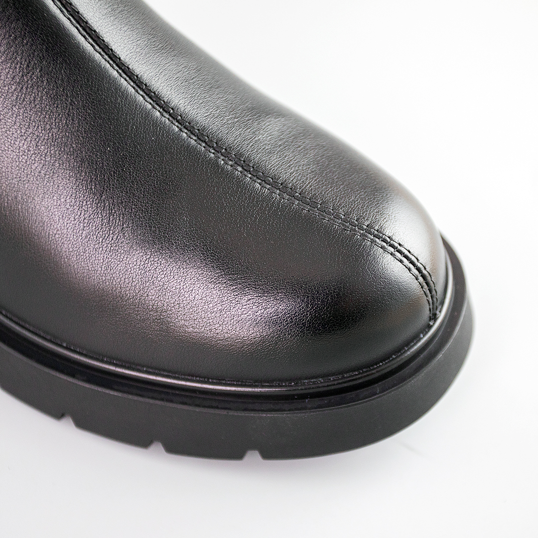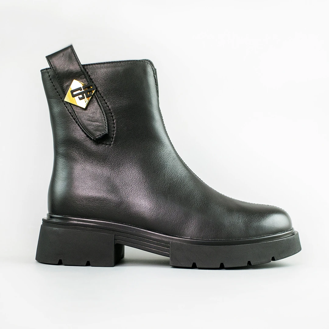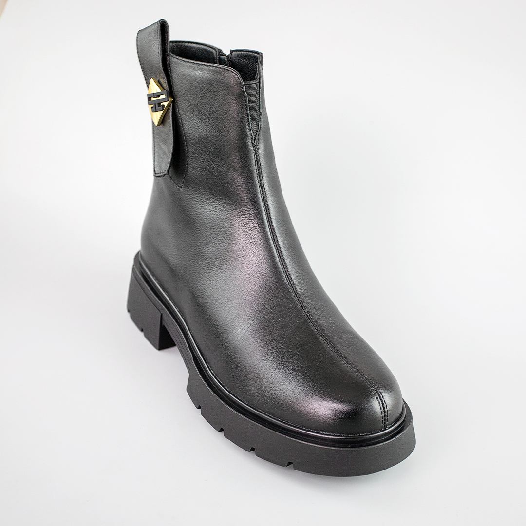 Стильные и тёплые кожаные ботинки в черном цвете. Подкладка из байки обеспечивает дополнительное тепло, что делает эти ботинки идеальными для прохладного времени года. Универсальны и подходят для всех возрастов, различных типов одежды и могут носиться как для повседневной жизни, так и для особых случаев. Будьте уверены в своем комфорте.