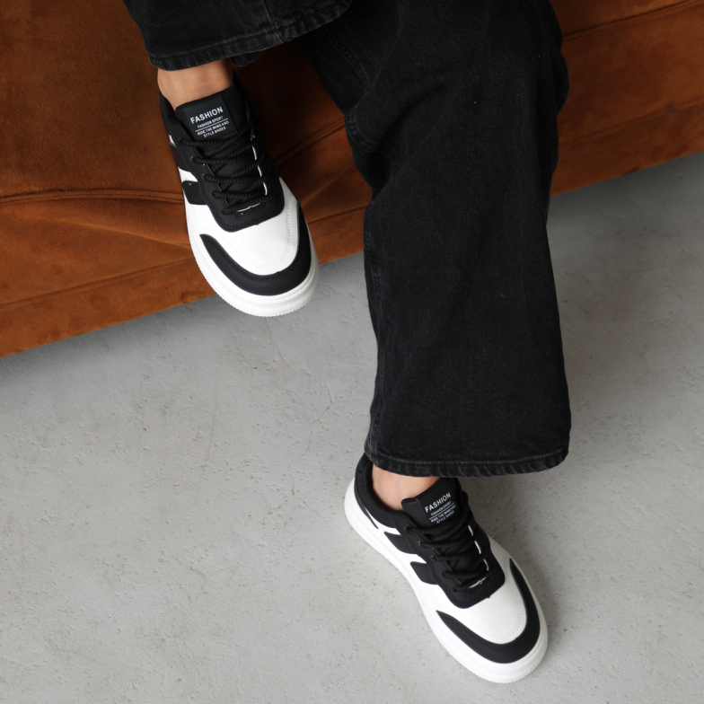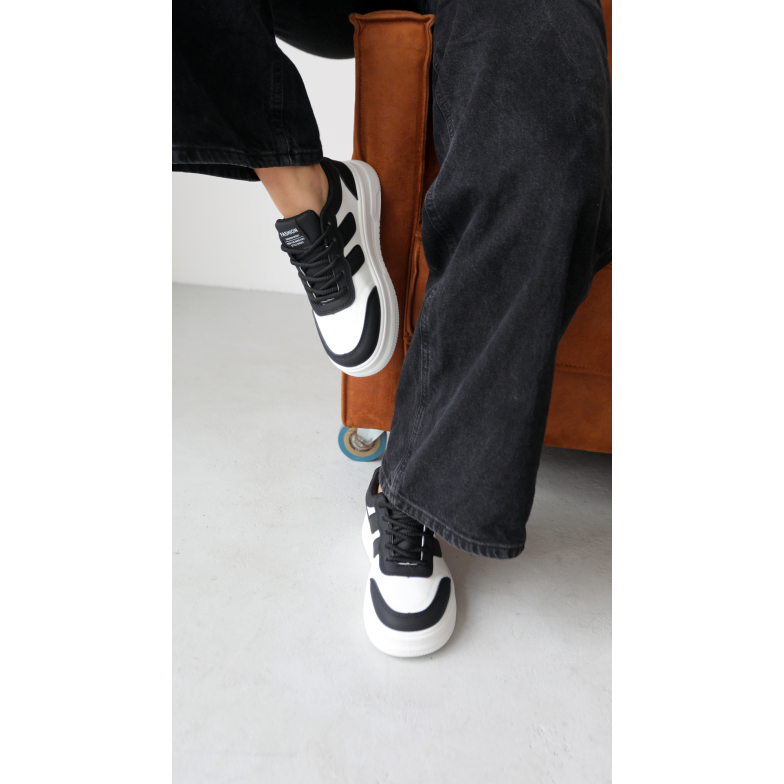 Предлагаем вам женские кроссовки в черно-белом цвете, отличающиеся актуальным дизайном и высокой комфортностью. Эта стильная пара изготовлена из качественной экокожи, что придает ей элегантность и обеспечивает практичность.