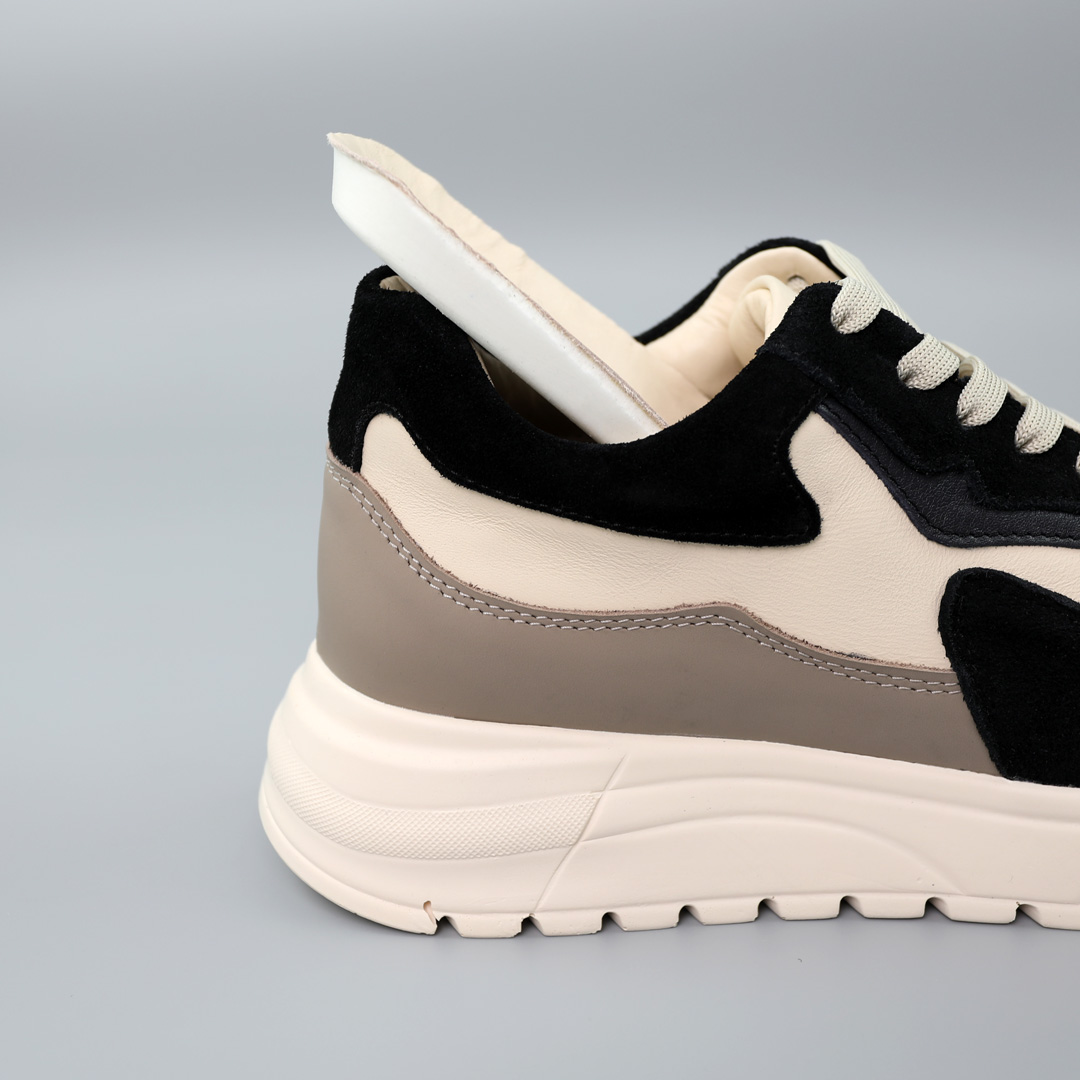 Бежево-черное сочетание цветов придает этим кроссовкам классический и изящный вид, а натуральная замша и кожа придает им не только визуальную привлекательность, но и ощущение комфорта. Эта модель идеально подходит для тех, кто ценит элегантность и функциональность каждой детали образа.