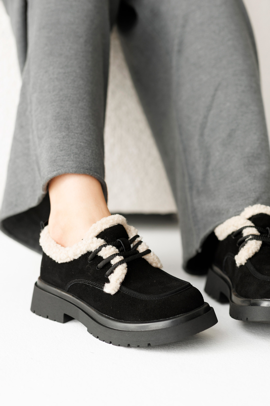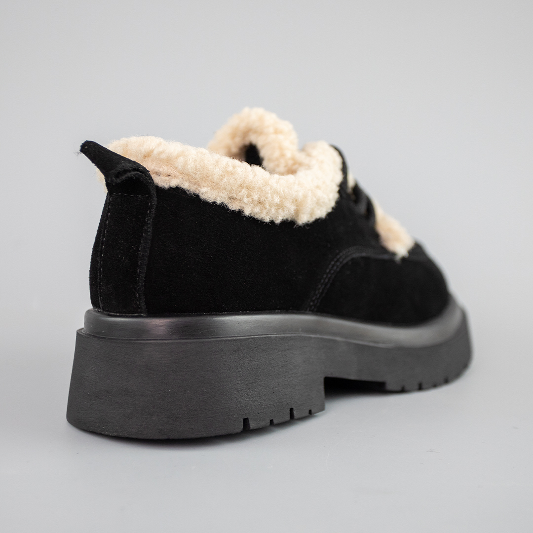 Женские замшевые черные лоферы, предназначенные для зимнего сезона. Изготовленные из высококачественной замши, наши лоферы гарантируют исключительное качество и стильный внешний вид. Натуральный материал подчеркивает их элегантность и придает изысканность. Высококачественная износостойкая подошва гарантирует надежность и стойкость в любых условиях.