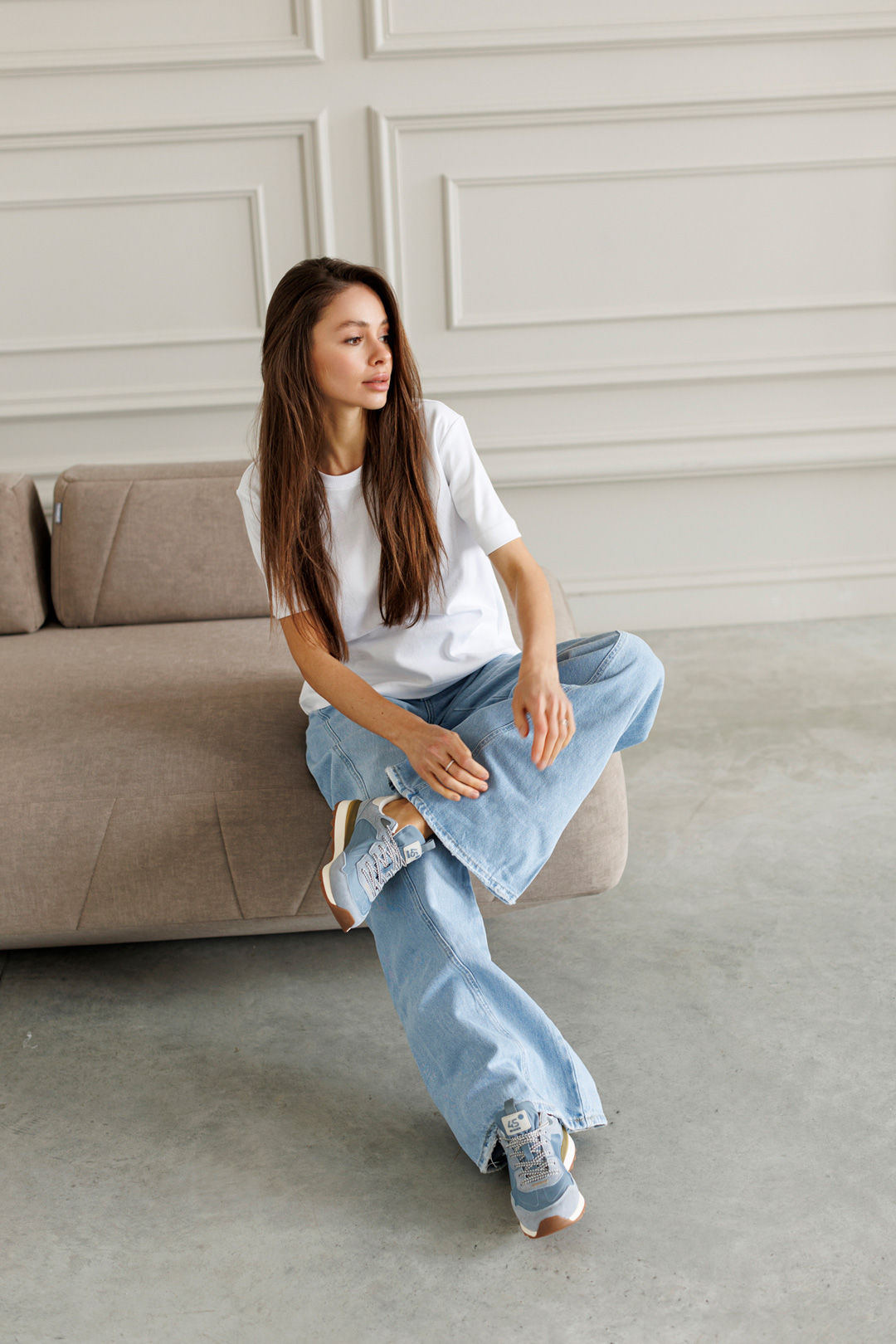 Трендовая модель джинсов Wide Leg (широкая от бедра), сочетающая в себе ретро-эстетику и современный уличный стиль. Главная особенность модели — вертикальные рельефные швы по центру брюк, которые создают эффект стрелок, визуально извлекают силуэт и придают образу структурированности.