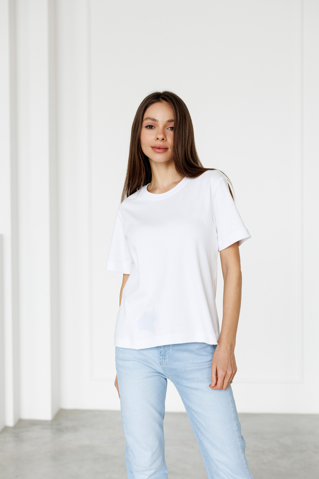 Легкая и универсальная футболка в универсальном белом цвете – идеальное основание для ежедневных образов. Минималистичный дизайн и свободный силуэт делают модель практичной и легкой в сочетании с джинсами, шортами, юбками или спортивными брюками.