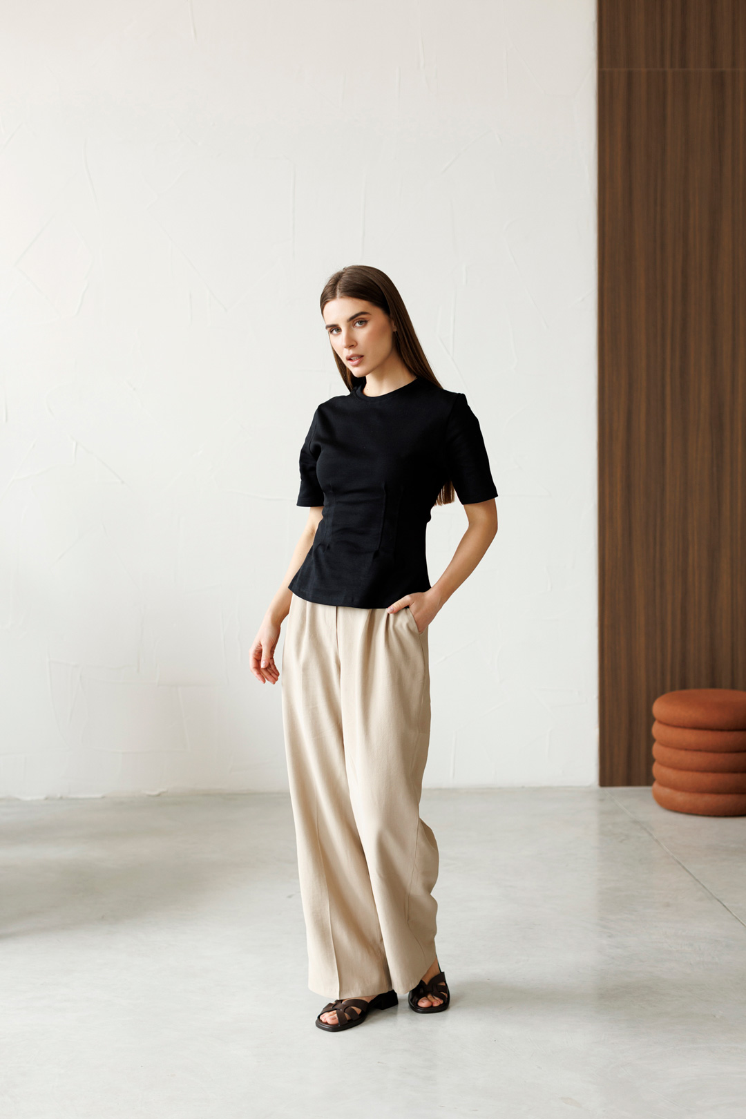 Легкая и универсальная футболка в черном цвете – идеальная основа для ежедневных образов. Минималистичный дизайн и приталенный силуэт делают модель практичной и легкой в сочетании с джинсами, шортами или юбками.