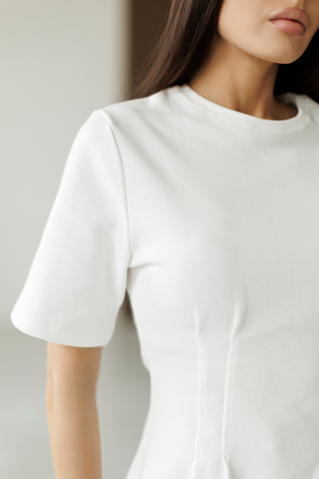 Легкая и универсальная футболка в белом цвете – идеальная основа для ежедневных образов. Минималистичный дизайн и приталенный силуэт делают модель практичной и легкой в сочетании с джинсами, шортами или юбками.