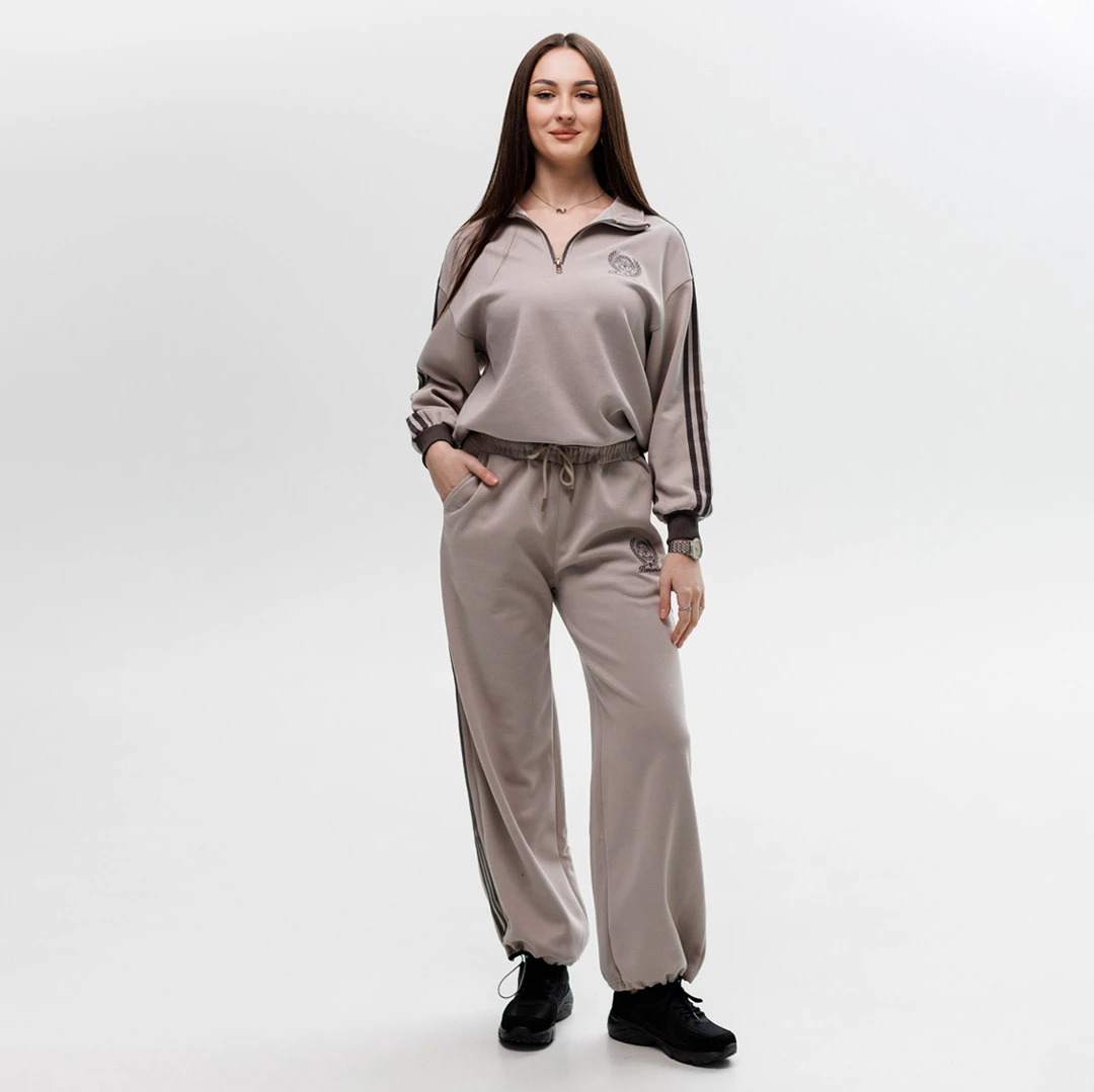 Стильный костюм в светлом оттенке – идеальный вариант для активного ритма жизни и комфортных повседневных образов. Комплект состоит из свободного свитшота на молнии с воротником-стойкой и удобных брюк с высокой посадкой.