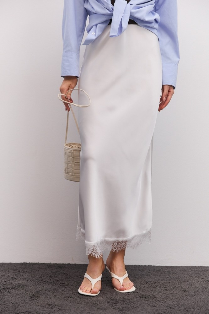 Длинная атласная юбка молочного цвета, декорированная внизу кружевом, станет прекрасной базой не только для праздничных, но и для повседневных образов. Она будет гармонично смотреться в сочетании с разнообразной одеждой, от нарядных блуз и топов до базовых лонгсливов и футболок.