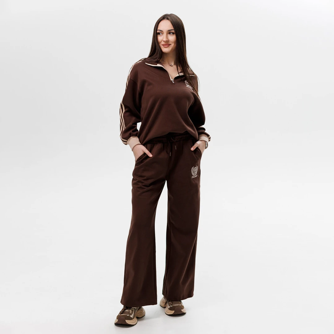 Комплект: свитшот на молнии + штаны Крой: свободный, комфортный Воротник : стойка с молнией Пояс : эластичный, со шнурком