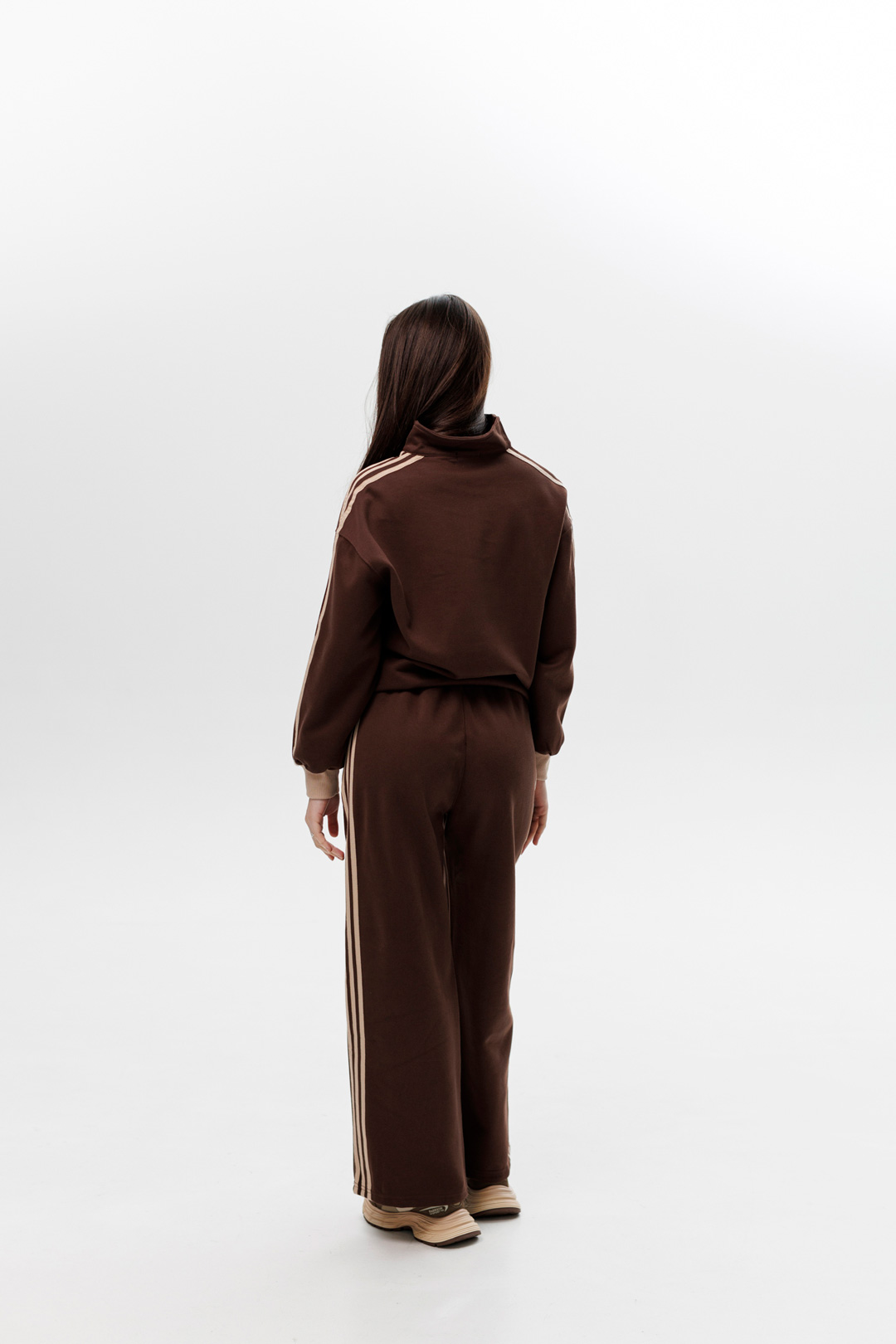 Стильный костюм в актуальном цвете станет идеальным вариантом для активного ритма жизни и комфортных повседневных образов. Комплект состоит из свободного свитшота на молнии с воротником-стойкой и удобных брюк с высокой посадкой. Верх имеет аккуратную застежку на молнии, спущенную линию плеча и контрастные лампасы вдоль рукавов, придающие образу динамичности. Брюки с эластичным поясом на шнурке обеспечивают комфортную посадку. Низ штанов с регулируемыми манжетами и создающими современный спортивный акцент.