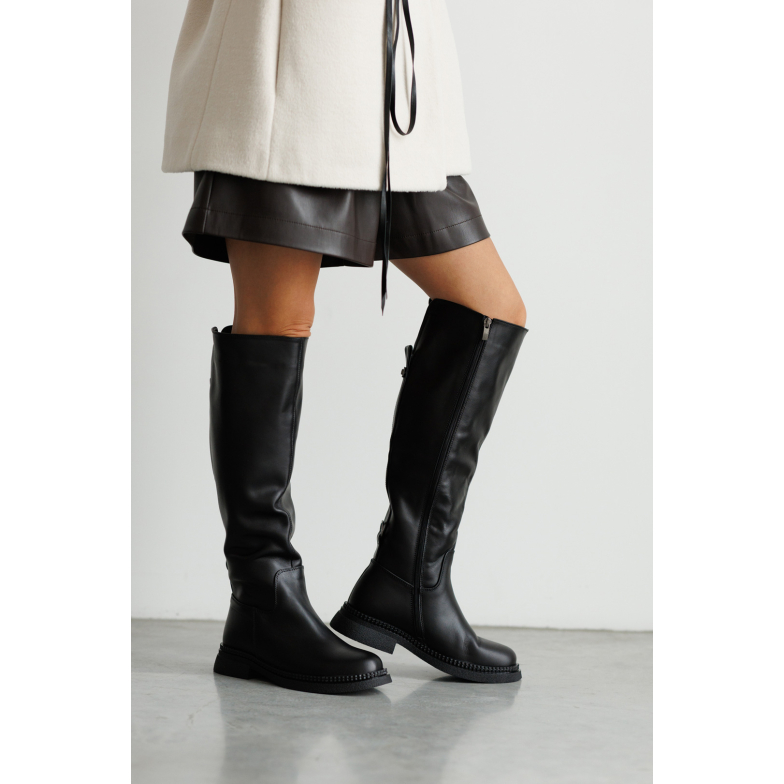 Елегантні жіночі чоботи в чорному кольорі виготовлені з високоякісної натуральної шкіри. Внутрішня підкладка по довжині - байка, щиколотка - натуральне хутро, що гарантують тепло і комфорт у холодну погоду, створюючи оптимальний мікроклімат для ніг. Завдяки подовженому фасону, вони візуально подовжують ноги та гармонійно поєднуються зі спідницями й сукнями.