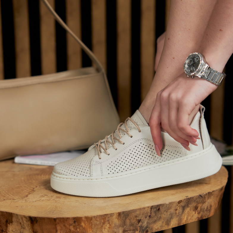Оберіть натуральну красу та стиль - оберіть наші жіночі кеди з перфорацією з натуральної шкіри, щоб створити вишуканий образ, що вразить своєю елегантністю.