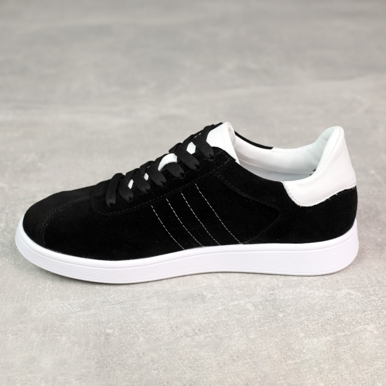 Актуальні жіночі кеди в чорному кольорі, виготовлені із поєднанням натуральної замші та шкіри. Легка та зручна модель ідеально підходить для щоденного носіння.