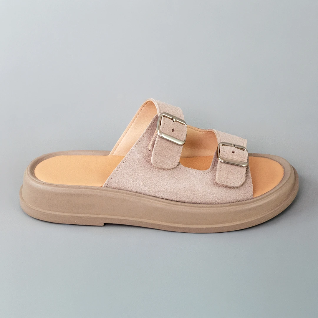 Відчуйте комфорт та практичність у кожному кроці з нашими жіночими шльопанцями з натуральної замші у бежевому кольорі. Ці шльопанці - незамінний аксесуар для активного життя, який поєднує в собі зручність та стиль.