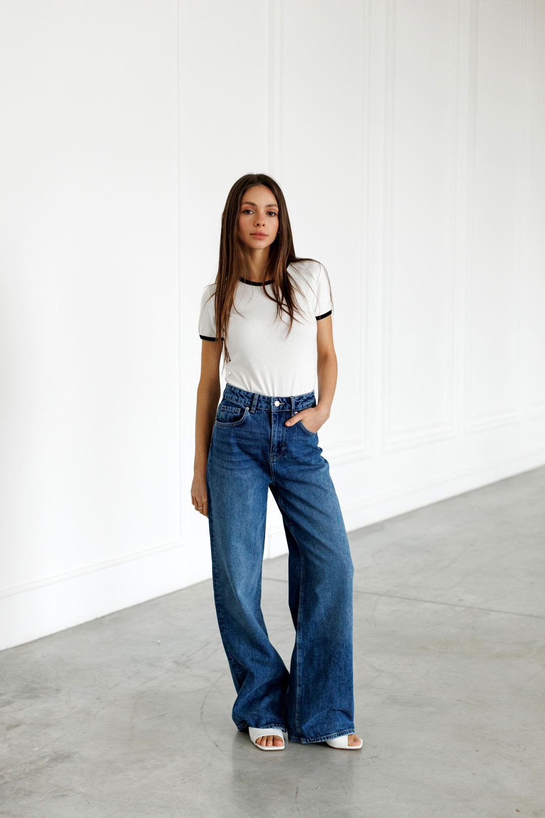Класичні джинси прямого крою, які ніколи не вийдуть з моди. Висока посадка акцентує увагу на талії, а рівні від стегна штанини створюють лаконічний та структурований силует. Особливістю моделі є глибокий синій колір із ефектом легкого «мармурового» виварювання, що надає виробу стильного ретро-вигляду.