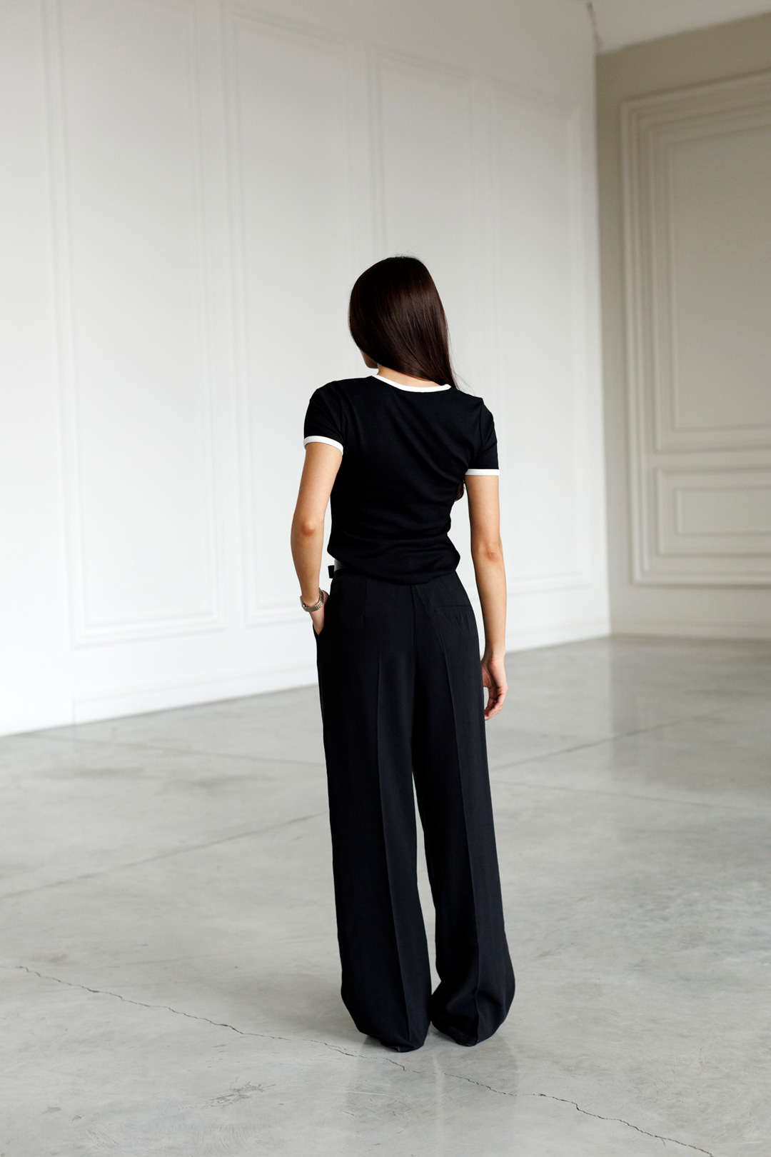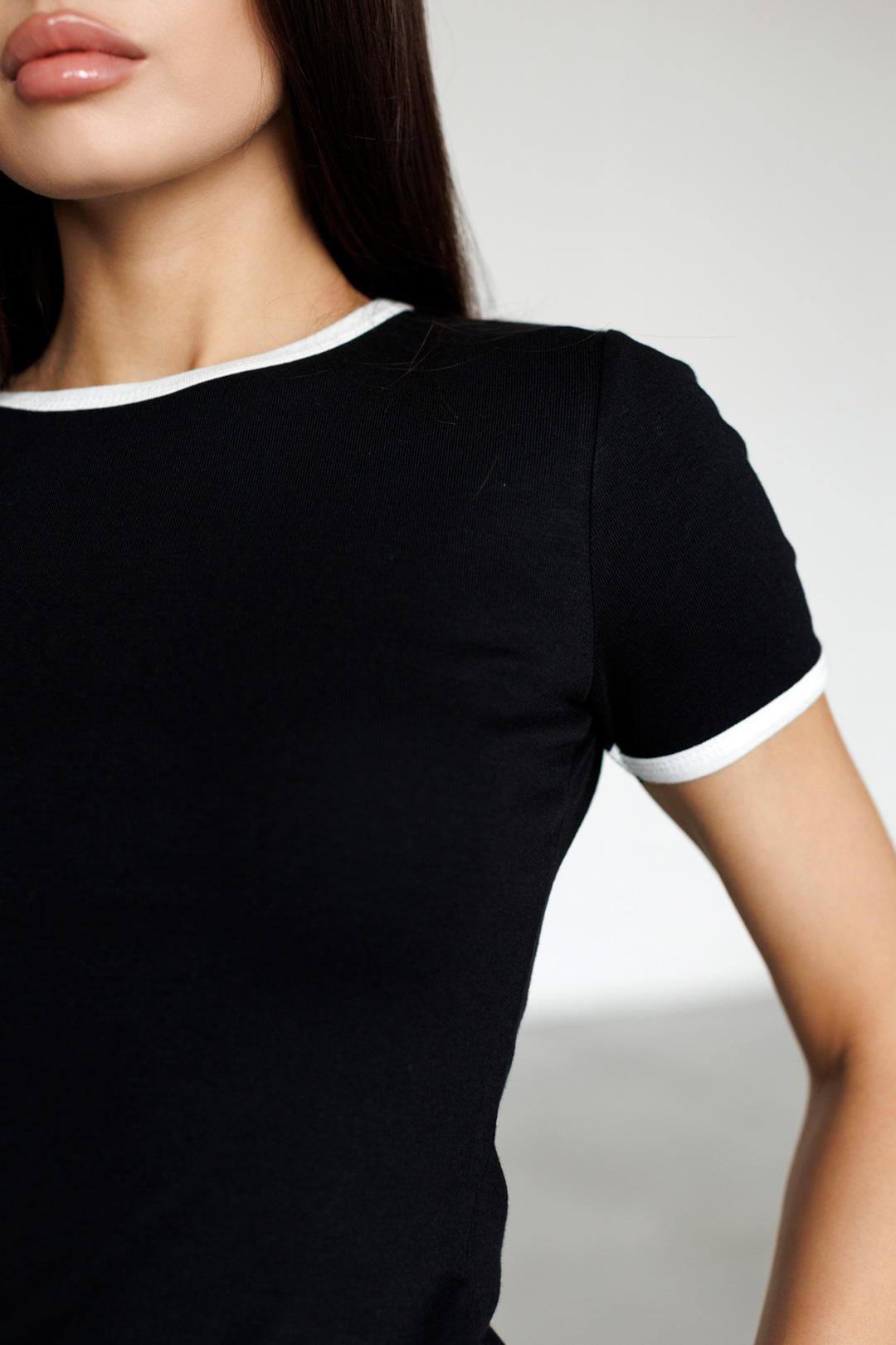 Базова футболка приталеного крою, яка виглядає стильно та лаконічно. Модель виконана в чорному кольорі з акцентним білим кантом на горловині та рукавах. Такий дизайн додає образу динамічності та легко вписується як у спортивні, так і в кежуал-аутфіти.