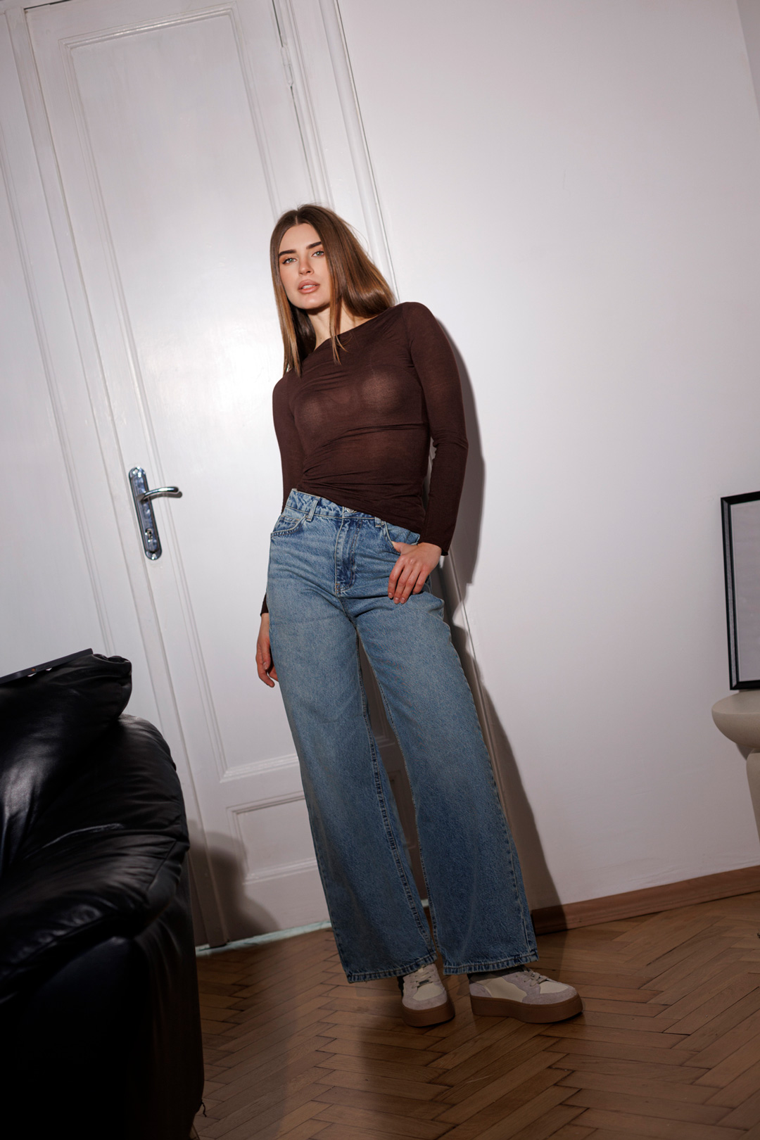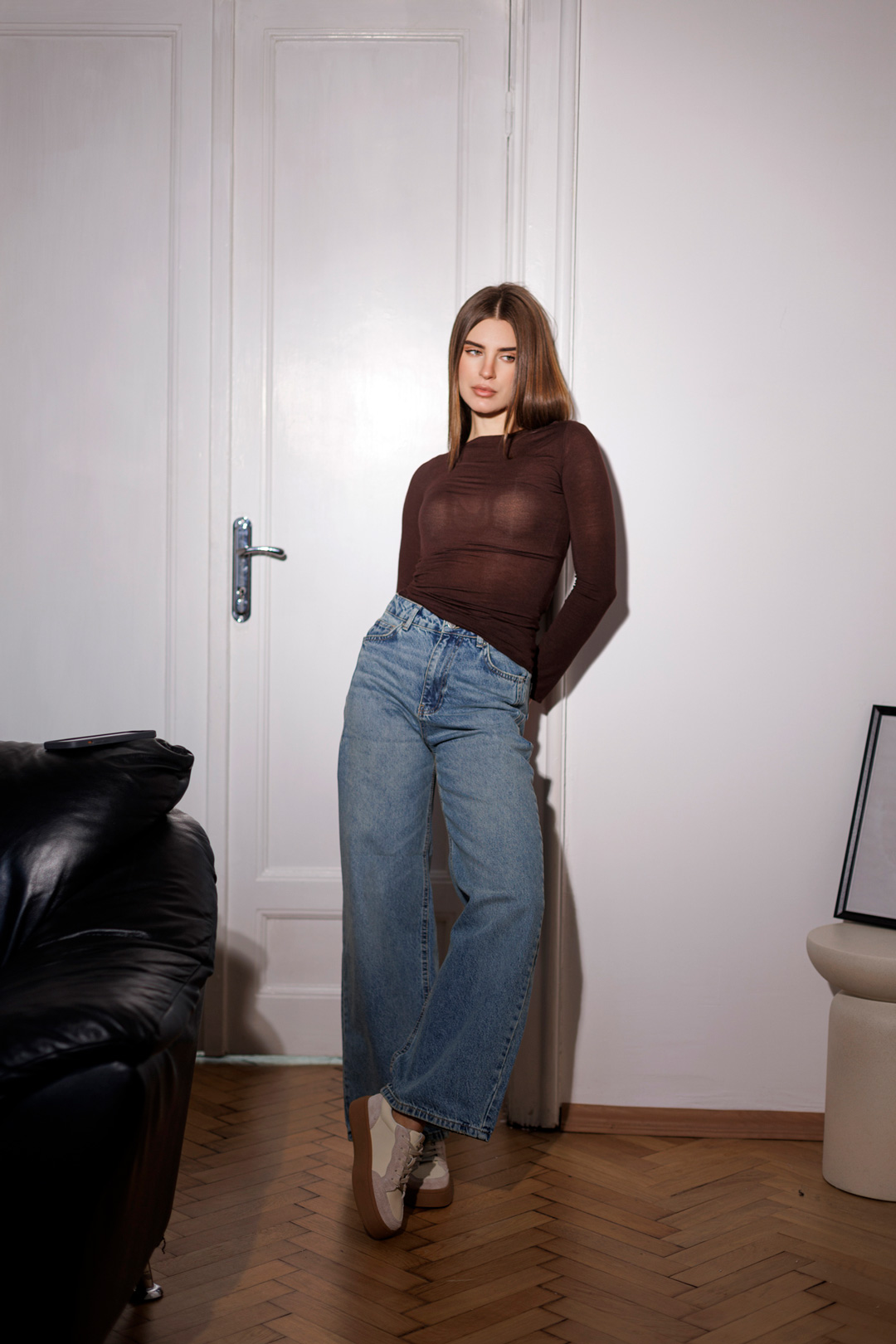 Базовий жіночий лонгслів. Облягаючий фасон, що підкреслює силует і візуально звужує талію. Виконаний з легкої, еластичної та напівпрозорої трикотажної тканини. Такий ефект додає образу делікатності та ніжності. Ідеально підходить для багатошарових образів або як самостійний елемент у поєднанні з джинсами з високою посадкою, спідницями чи брюками.