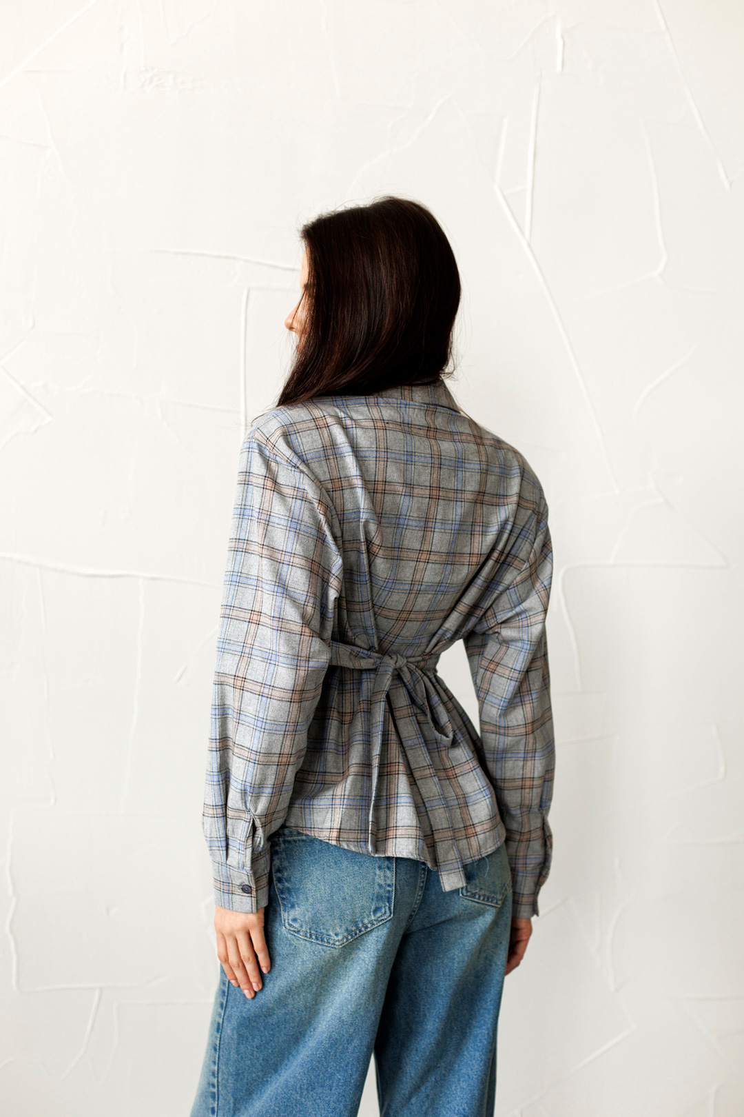 Унікальна сорочка, що структурує силует та додає образу характеру. Головною особливістю моделі є вбудовані підплічники, які створюють актуальну лінію плеча у стилі 80-х, та втачний пояс-зав'язка ззаду, що дозволяє ідеально підкреслити талію, зберігаючи при цьому вільний крій спереду.